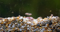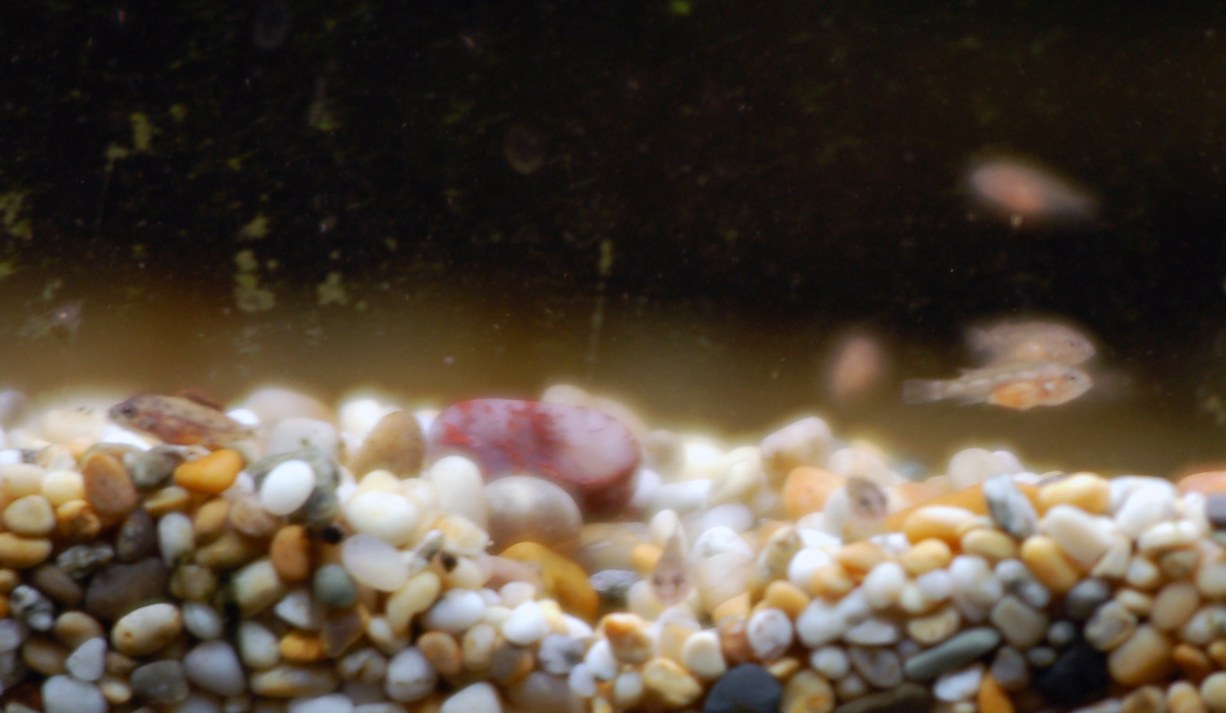 kolme poikasta hajallaan ympäri akvaariota. Puoleen päivään mennessä näistäkin oli kaksi hävinnyt ja viimeisen pelastimme