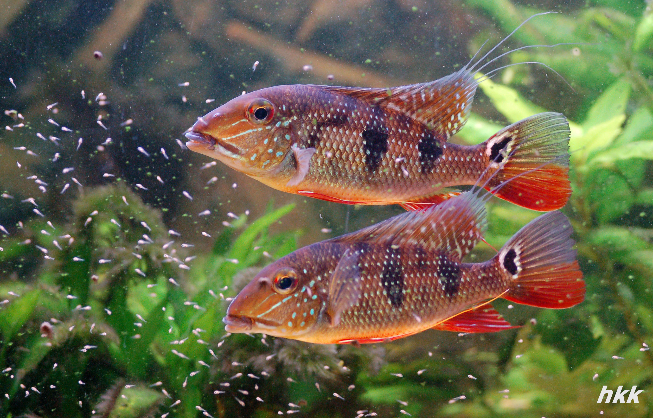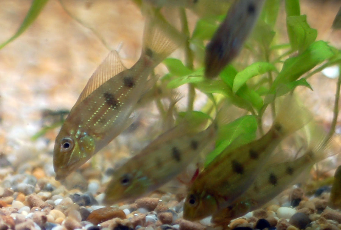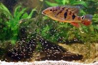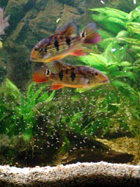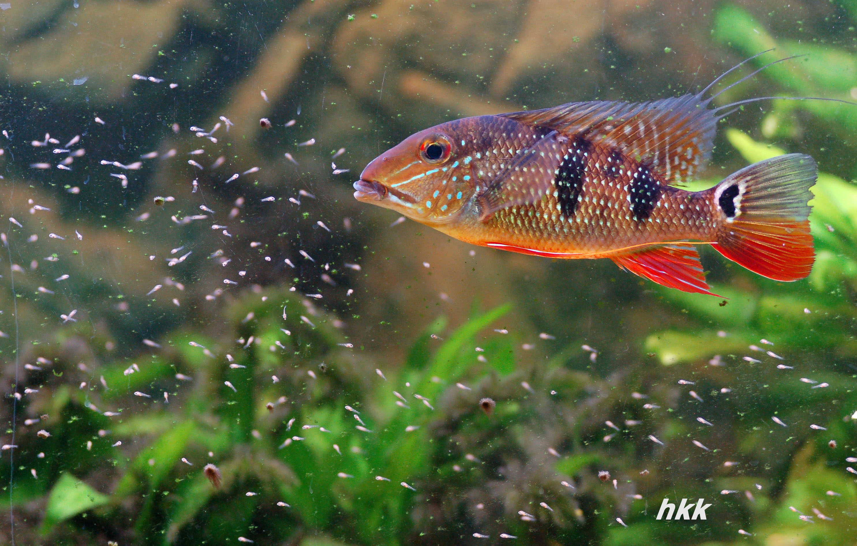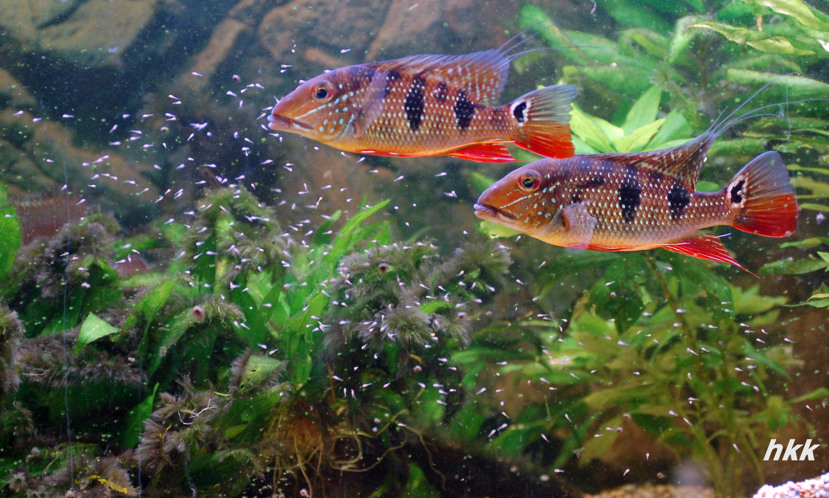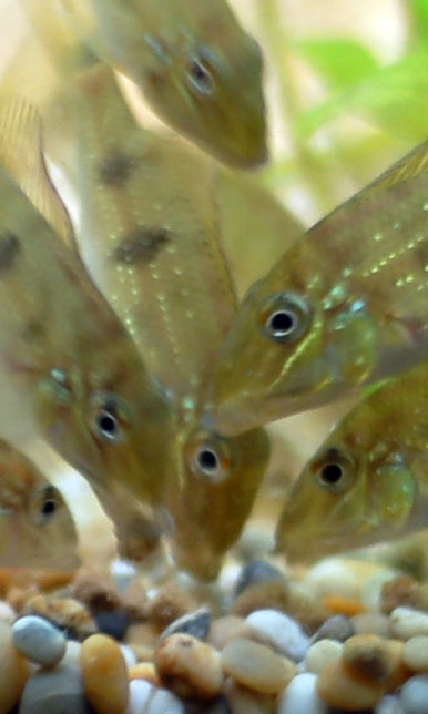 Vanhempien hoidossa isossa akvaariossa on nyt jäljellä noin tusina poikasta. Emot huolehtivat poikasista edelleen