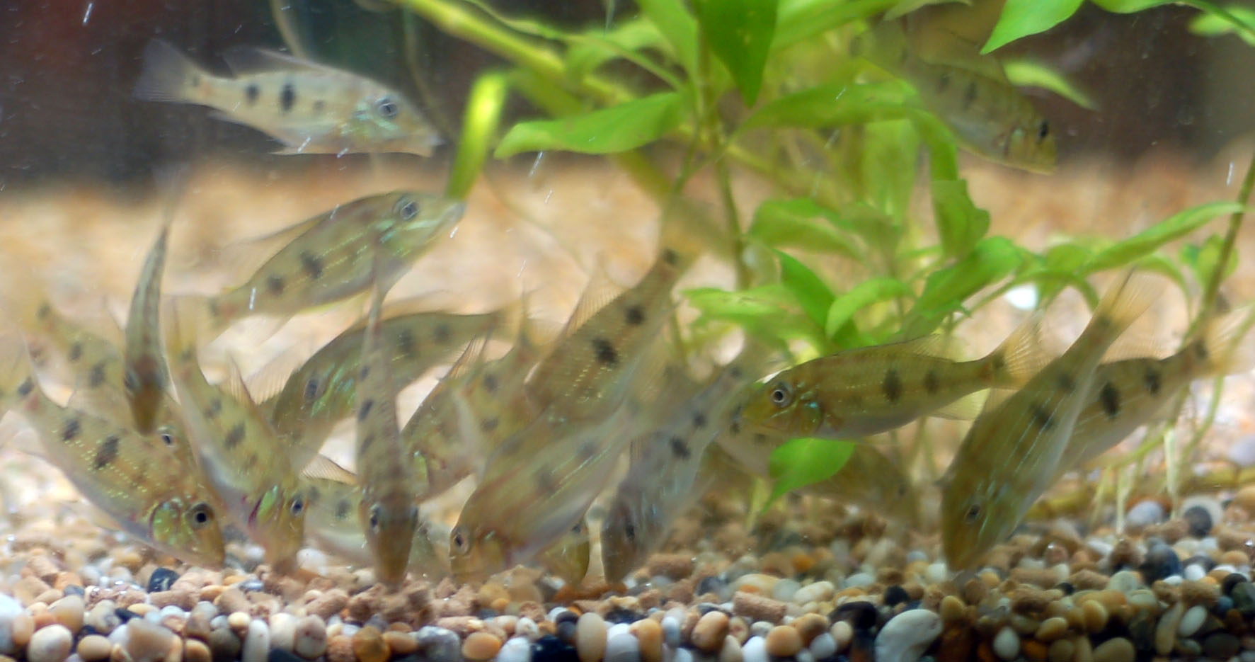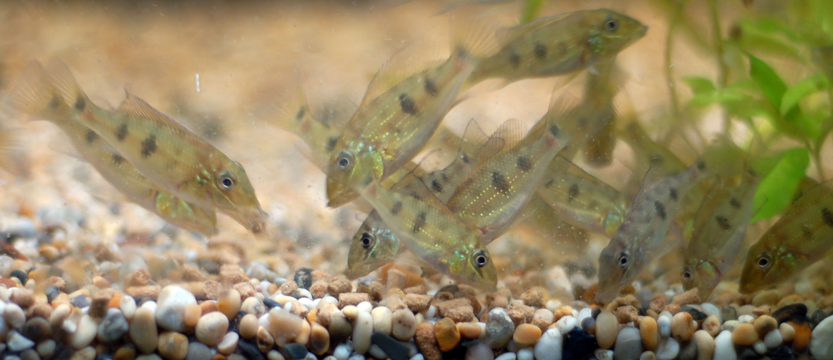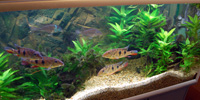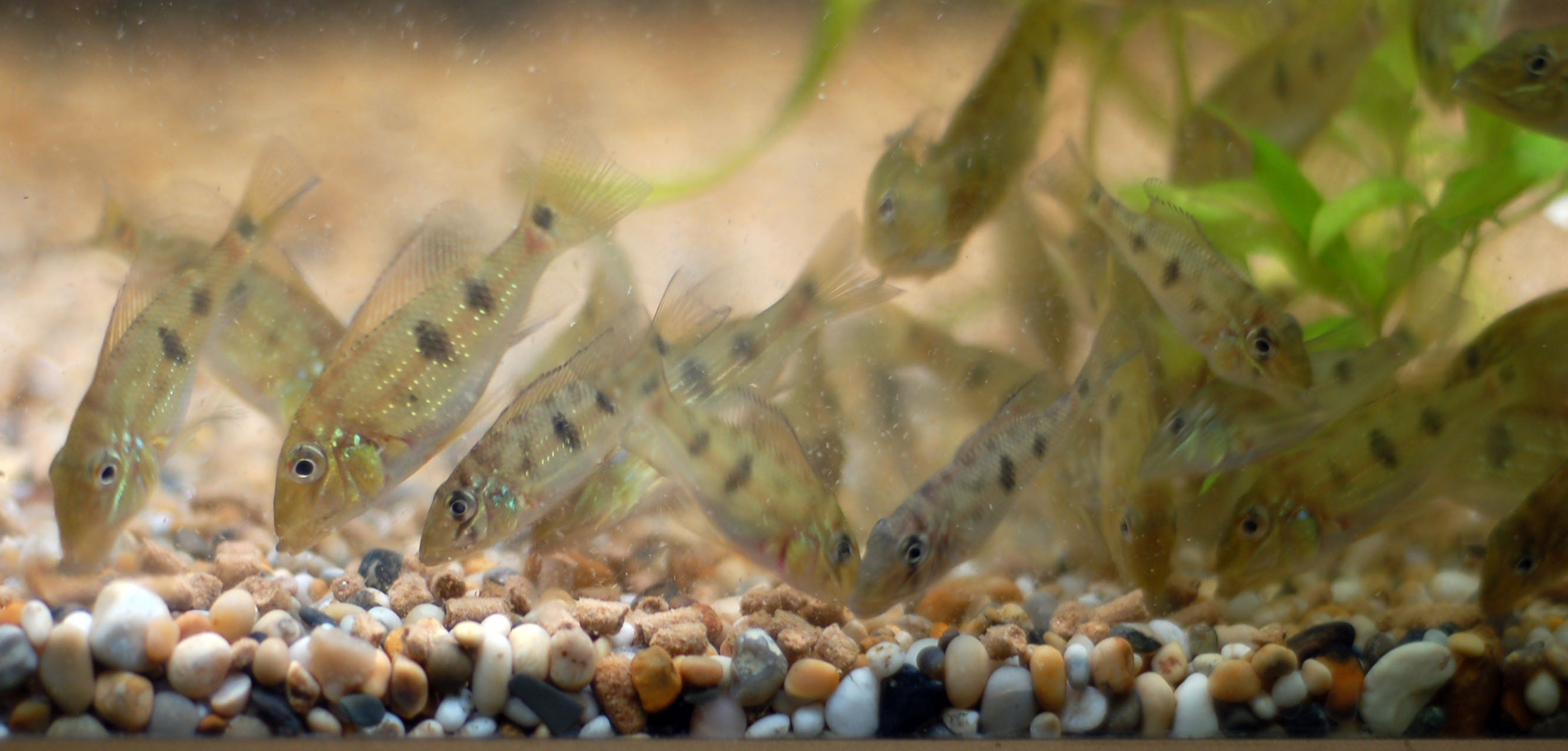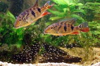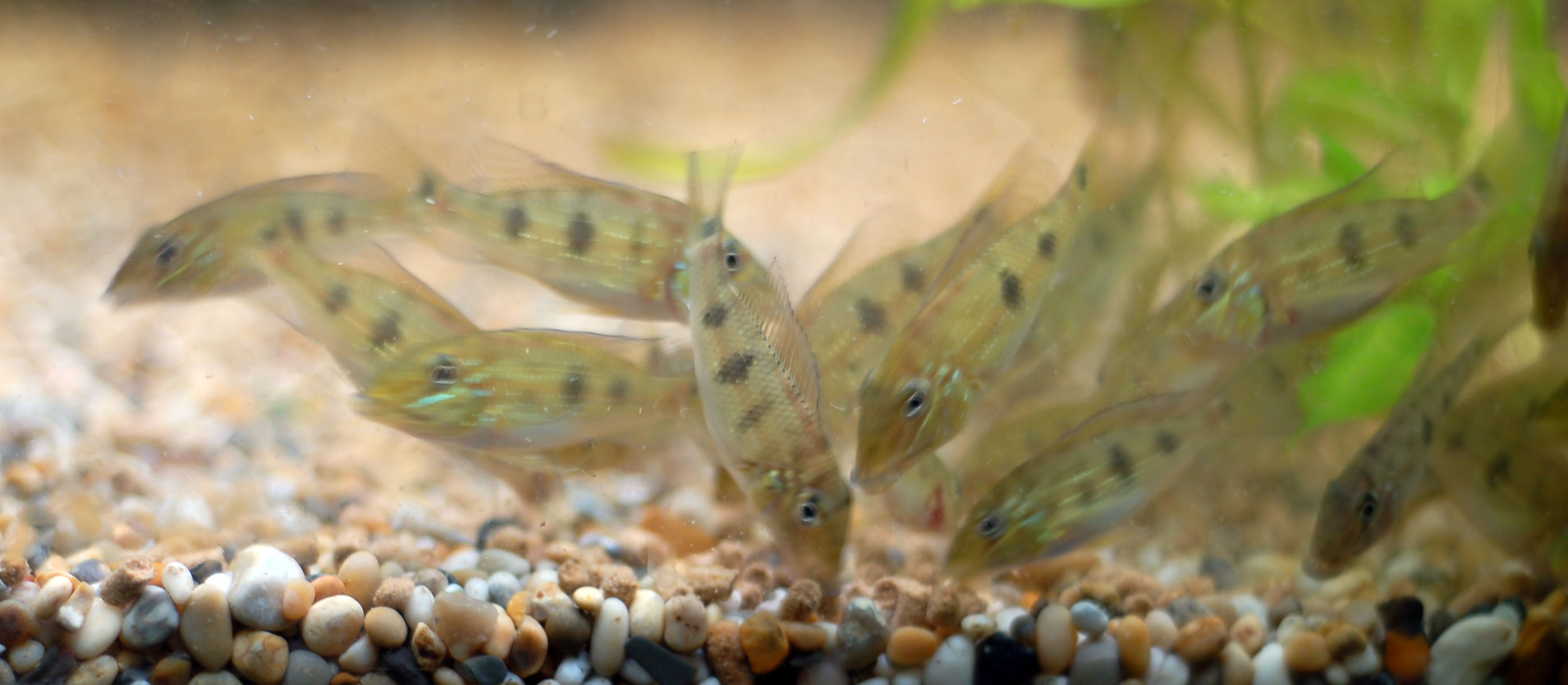Vanhempien hoidossa isossa akvaariossa on nyt jäljellä noin tusina poikasta. Emot huolehtivat poikasista edelleen